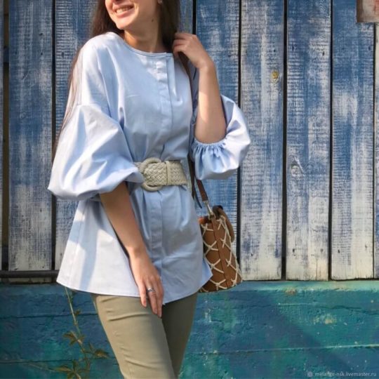 Romantic blouse with puffed sleeves harmoniously complemented by a woven belt - a fashion trend of recent seasons.