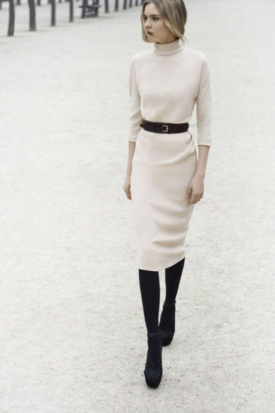 The turtleneck dress can be worn with a minimalist belt without details. Complete the outfit with a strictly shaped bag and your stylish outfit is ready.